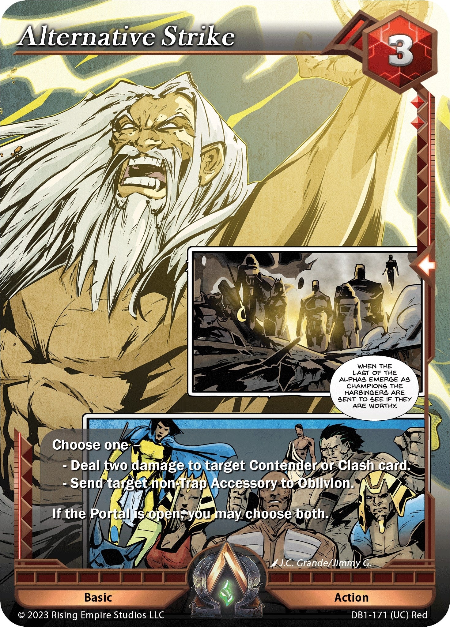 Description: | Choose one -- - Deal two damage to target Contender or Clash card. - Send target non-Trap Accessory to Oblivion. If the Portal is open, you may choose both. |