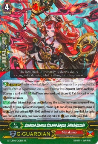 Description: | [G guardian] (Usable when both fighters' vanguards are grade 3 or greater, and the number of face up G guardians in your G zone if three or less)-Opponent Turn's Guard Step-[Choose a card with "Heal" from your hand, and discard it] Call this card to your (GC) from face down.