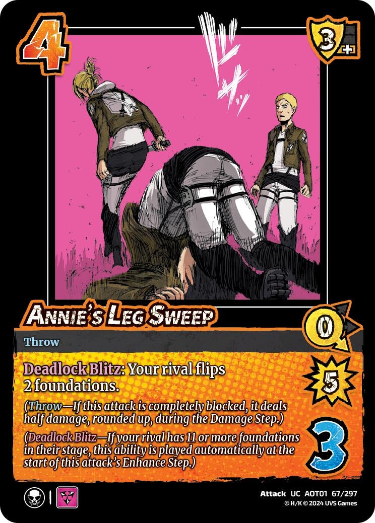 Deadlock Blitz: Your rival flips 2 foundations. (Throw—If this attack is completely blocked, it deals half damage, rounded up, during the Damage Step.) (Deadlock Blitz—If your rival has 11 or more foundations in their stage, this ability is played automatically at the start of this attack's Enhance Step.) |