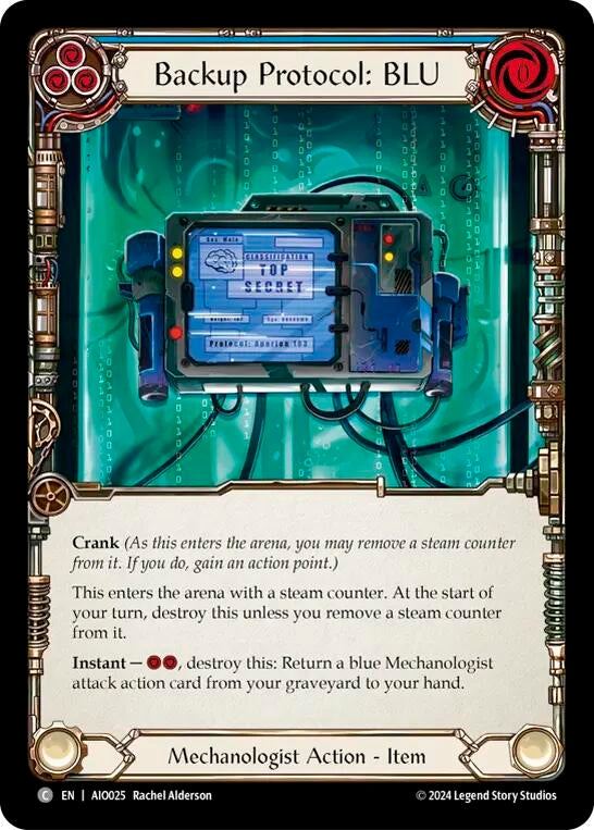 Crank (As this enters the arena, you may remove a steam counter from it. If you do, gain an action point.) This enters the arena with a steam counter. At the start of your turn, destroy this unless you remove a steam counter from it. Instant — [2 Resource], destroy this: Return a blue Mechanologist attack action card from your graveyard to your hand. |