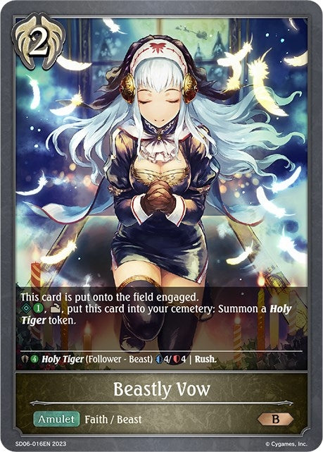 [Act] [1], [Engage], put this card into your cemetery: Summon a Holy Tiger token. [Havencraft][4] Holy Tiger (Follower - Beast) [Attack]4/[Defense]4 | Rush. |