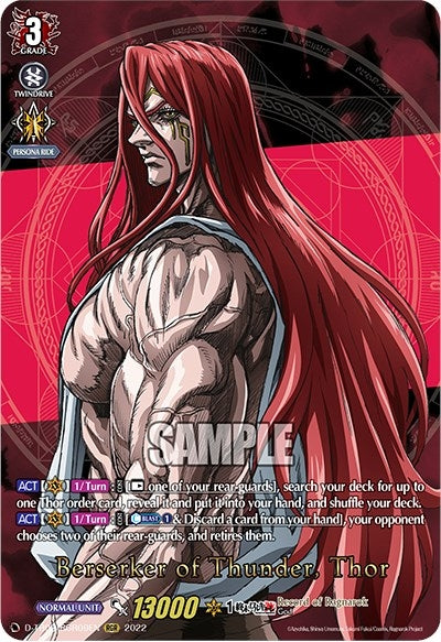 Description: | [ACT](VC)[1/turn]:[COST][[Rest] one of your rear-guards], search your deck for up to one Thor order card, reveal it and put it into your hand, and shuffle your deck. [ACT](VC)[1/turn]:[COST][Counter-Blast 1 & Discard a card from your hand], your opponent chooses two of their rear-guards, and retires them. |