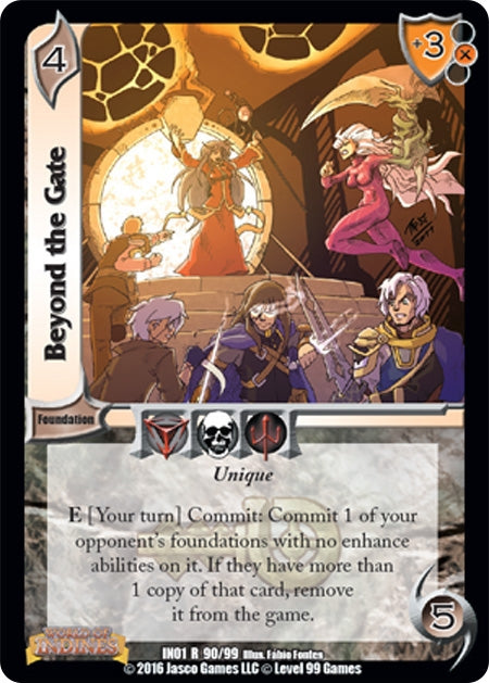 E [Your turn] Commit: Commit 1 of your opponent’s foundations with no enhance abilities on it. If they have more than 1 copy of that card, remove it from the game.