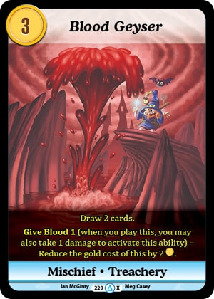 Description: | Draw 2 cards. Give Blood 1 (When you play this, you may also take 1 damage to activate this ability.) - Reduce the gold cost of this by 2 [gold]. |