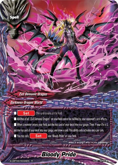 Abilities of all "Evil Demonic Dragon" on your field cannot be nullified by your opponent's card effects. When a monster enters your field, put the top card of your deck into your gauge. Then, if your life is 1, put the top card of your deck into your gauge, and draw a card. This ability only activates once per turn. You may only [Set] one "Bloody Pride" on your field. |