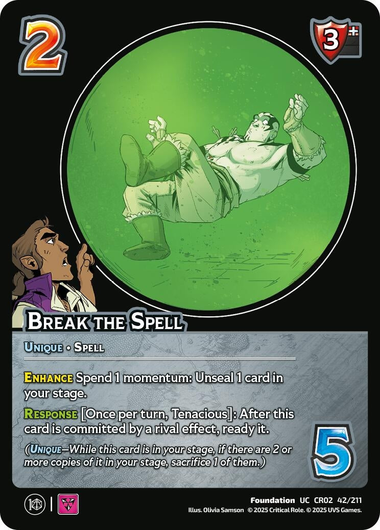 Enhance Spend 1 momentum: Unseal 1 card in your stage. Response [Once per turn, Tenacious]: After this card is committed by a rival effect, ready it. (Unique—While this card is in your stage, if there are 2 or more copies of it in your stage, sacrifice 1 of them.) |