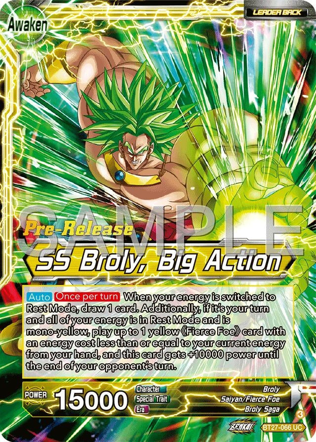 Description: | [Auto] When this card attacks, draw 1 card. [Awaken] When your life is at 4 or less, or you have 2 or more energy and a yellow Z-Unison with a specitied cost of 2 in play : Draw 1 card, switch up to 1 of your energy to Active Mode, and add cards from your life to your hand until you have 4 life left. SS Broly, Big Action [Auto] [Once per turn] When your energy is switched to Rest Mode, draw 1 card. Additionally, if it's your turn and all of your energy is in Rest Mode and is mono-yellow, play up to 1 yellow "Fierce Foe" card with an energy cost less than or equal to your current energy from your hand, and this card gets +10000 power until the end of your opponent's turn. |