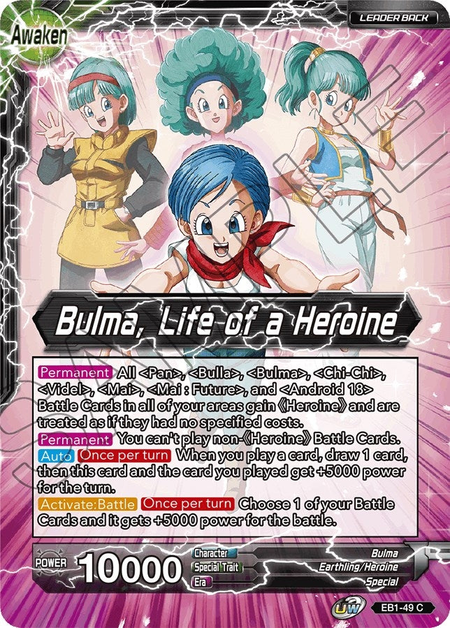 [Permanent] You can't play non-"Heroine" Battle Cards. [Auto] [Once per turn] When you play a card, draw 1 card, then this card and the card you played get +5000 power for the turn. [Awaken] When your life is at 5 or less : You may draw 1 card, switch up to 1 of your energy to Active Mode, then flip this card over. Bulma, Life of a Heroine [Permanent] All "Pan", "Bulla", "Bulma", "Chi-Chi", "Videl", "Mai", "Mai: Future", and "Android 18" Battle Cards in all of your areas gain "Heroine" and are treated as if they had no specified costs. [Permanent] You can't play non-"Heroine" Battle Cards. [Auto] [Once per turn] When you play a card, draw 1 card, then this card and the card you played get +5000 power for the turn. [Activate:Battle] [Once per turn] Choose 1 of your Battle Cards and it gets +5000 power for the battle. |
