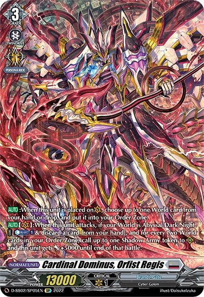 Description: | [AUTO]:When this unit is placed on (VC), choose up to one World card from your hand or drop, and put it into your Order Zone. [AUTO](VC):When this unit attacks, if your World is Abyssal Dark Night, [COST][Counter-Blast 1] & discard a card from your hand], and for every two World cards in your Order Zone, call up to one Shadow Army token to (RC), and this unit gets [Power] +5000 until end of that battle. |