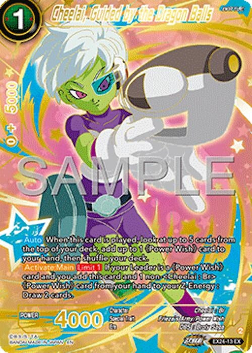 Description: | [Auto] When this card is played, look at up to 5 cards from the top of your deck, add up to 1 "Power Wish" card to your hand, then shuffle your deck. [Activate:Main] [Limit 1] If your Leader is a "Power Wish" card and you add this card and 1 non-"Cheelai : Br" "Power Wish" card from your hand to your Z-Energy : Draw 2 cards. |