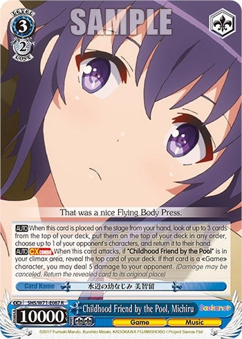 | Card Text: | [AUTO] When this card is placed on the stage from your hand, look at up to 3 cards from the top of your deck, put them on the top of your deck in any order, choose up to 1 of your opponent's characters, and return it to their hand. [AUTO] [CXCOMBO] When this card attacks, if "Childhood Friend by the Pool" is in your climax area, reveal the top card of your deck. If that card is a "Game" character, you may deal 5 damage to your opponent. (Damage may be canceled. Return the revealed card to its original place) |