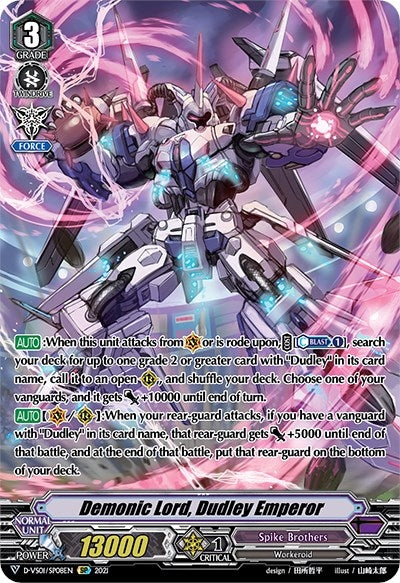 [AUTO]:When this unit attacks from (VC) or is rode upon, [COST][Counter-Blast 1], search your deck for up to one grade 2 or greater card with "Dudley" in its card name, call it to an open (RC), and shuffle your deck. Choose one of your vanguards, and it gets [Power] +10000 until end of turn.