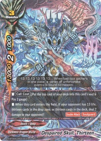 When this card enters the field, if your opponent has 13 life, thirteen cards in the drop zone, or thirteen cards in the deck, deal 7 damage to your opponent!! [Double Attack] [Soulguard] |