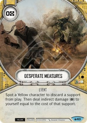 | Description: | Spot a Yellow character to discard a support from play. Then deal indirect damage to yourself equal to the cost of that support. |