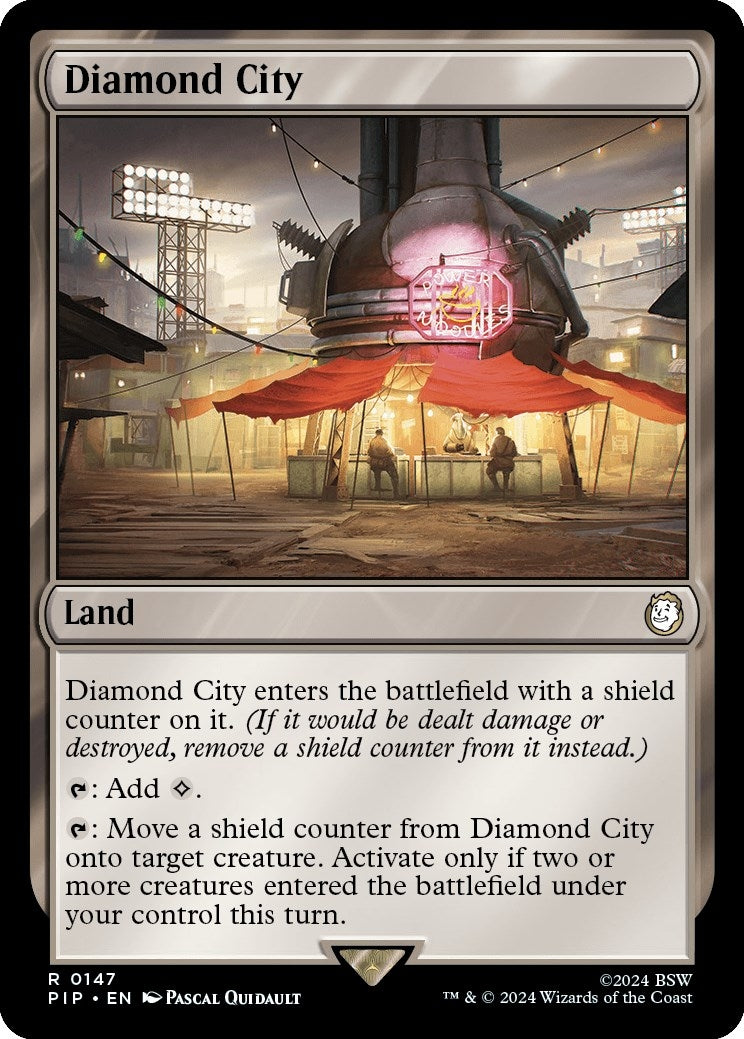 Rules Text Contains: | Diamond City enters the battlefield with a shield counter on it. (If it would be dealt damage or destroyed, remove a shield counter from it instead.)