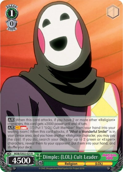[AUTO] [CXCOMBO] [(1) Put 1 "(LOL) Cult Member" from your hand into your waiting room] When this card attacks, if "What a Wonderful Smile!" is in your climax area, and you have another "Religion" character, you may pay the cost. If you do, search your deck for up to 2 green or "Esper" characters, reveal them to your opponent, put them into your hand, and shuffle your deck. |