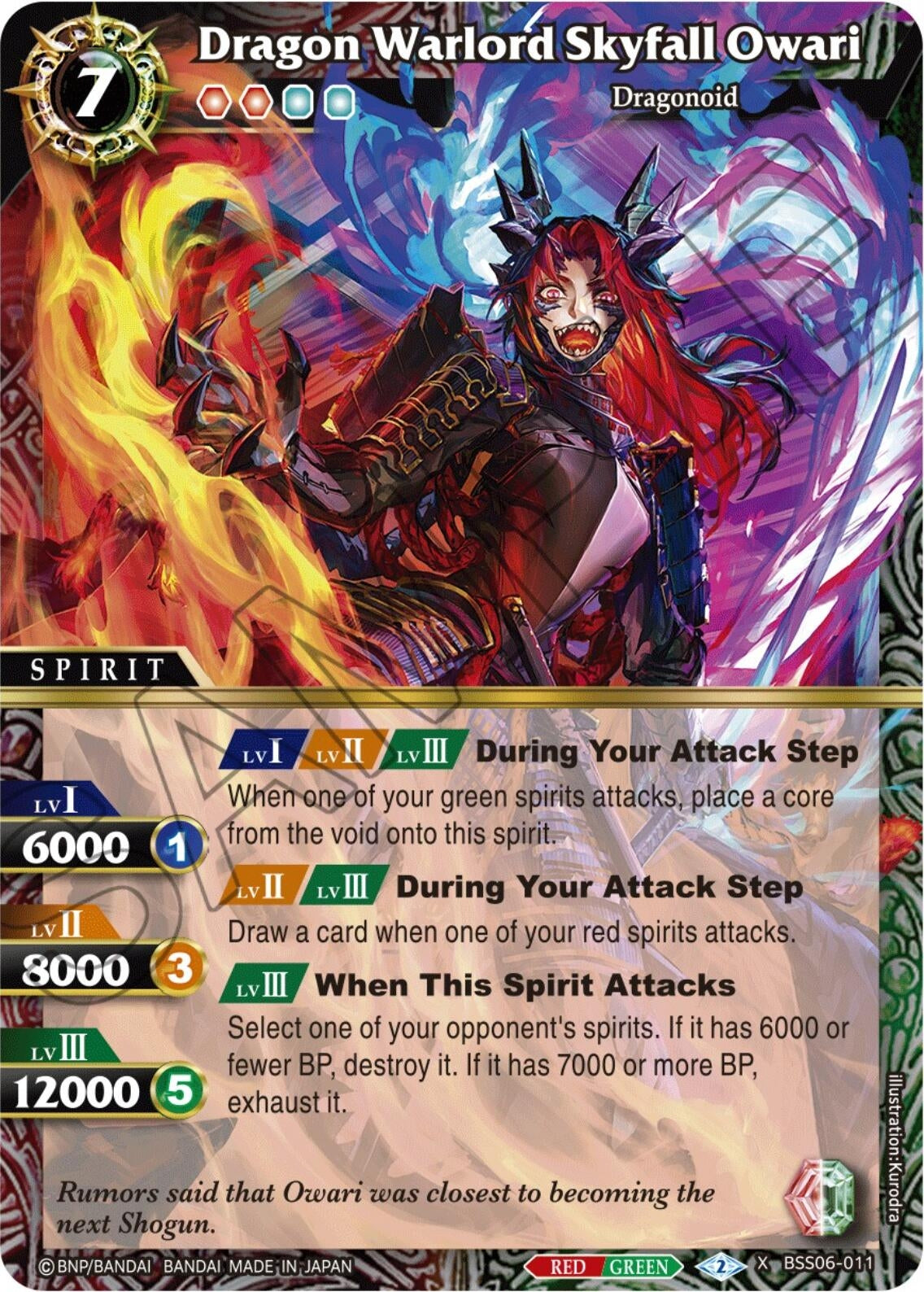 When one of your green spirits attacks, place a core from the void onto this spirit. [LV2-LV3] During Your Attack Step Draw a card when one of your red spirits attacks. LV3] When This Spirit Attacks Select one of your opponent's spirits. If it has 6000 or fewer BP, destroy it. If it has 7000 or more BP, exhaust it. |