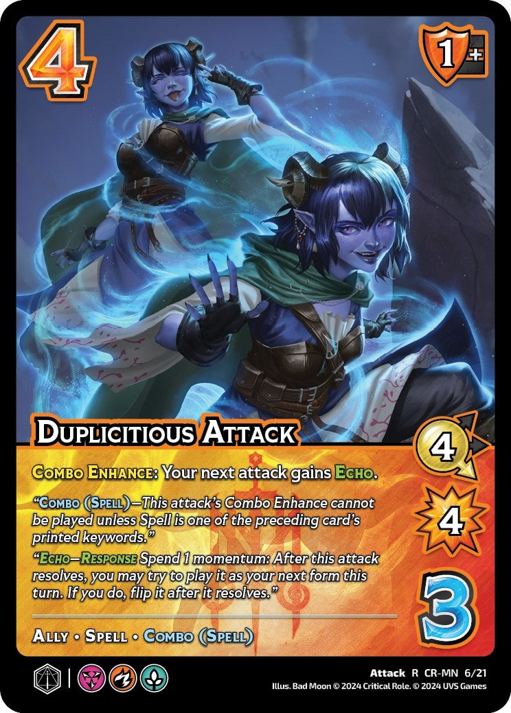 Combo Enhance: Your next attack gains Echo. “Combo (Spell)—This attack’s Combo Enhance cannot be played unless Spell is one of the preceding card’s printed keywords.” “Echo—Response Spend 1 momentum: After this attack resolves, you may try to play it as your next form this turn. If you do, flip it after it resolves.” |