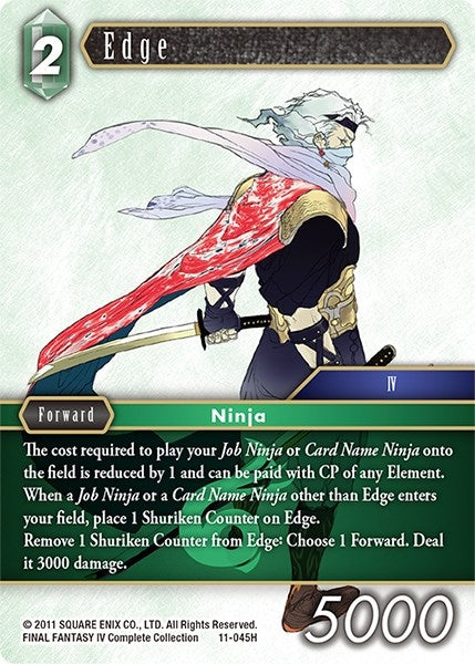 When a Job Ninja or a Card Name Ninja other than Edge enters your field, place 1 Shuriken Counter on Edge. Remove 1 Shuriken Counter from Edge: Choose 1 Forward. Deal it 3000 damage. |