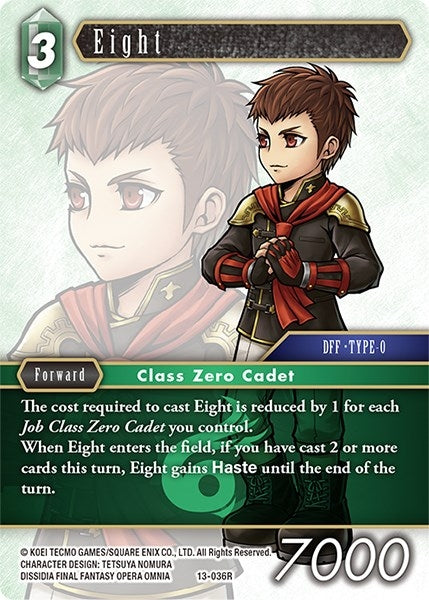 | Description: | The cost required to cast Eight is reduced by 1 for each Job Class Zero Cadet you control. When Eight enters the field, if you have cast 2 or more cards this turn, Eight gains Haste until the end of the turn. |