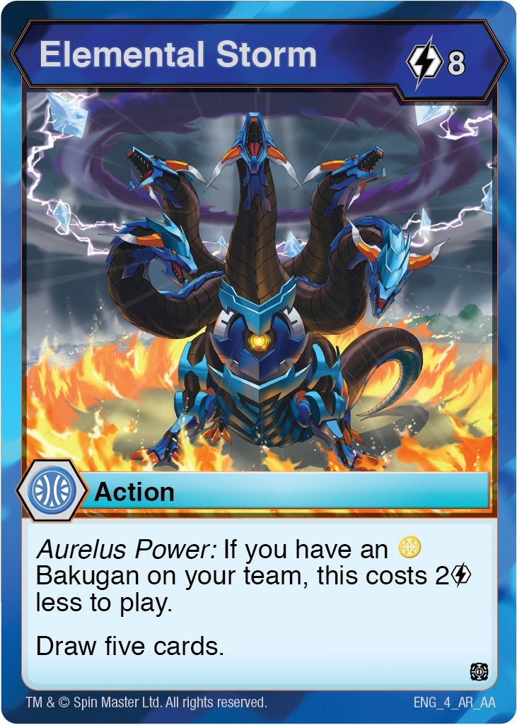Aurelus Power: If you have an [Aurelus] Bakugan on your team, this costs 2[Energy] less to play. Draw five cards. |