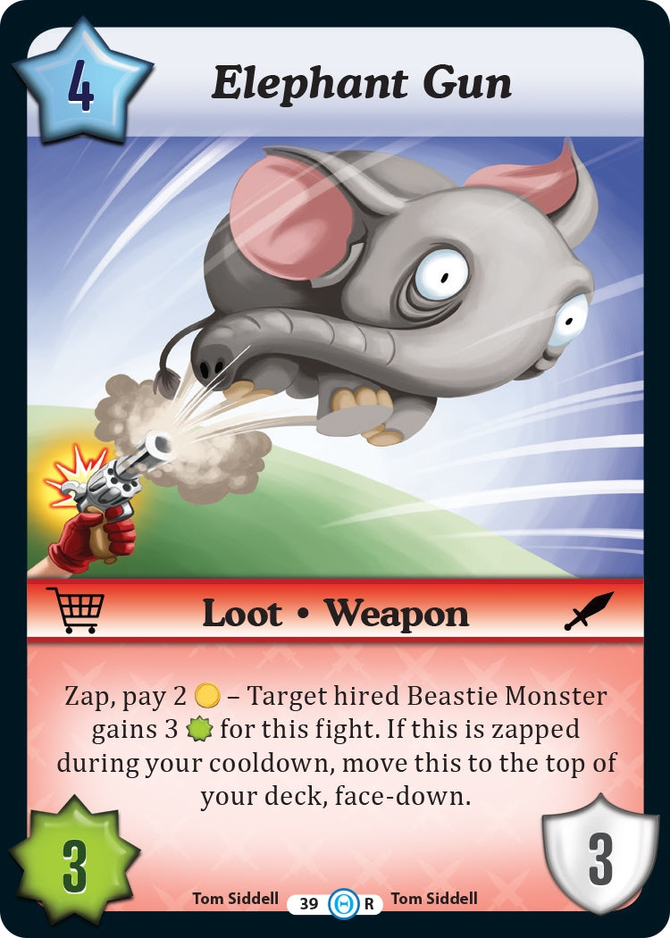 Zap, pay 2 [gold] – Target hired Beastie Monster gains 3 [power] for this fight. If this is zapped during your cooldown, move this to the top of your deck, face-down.