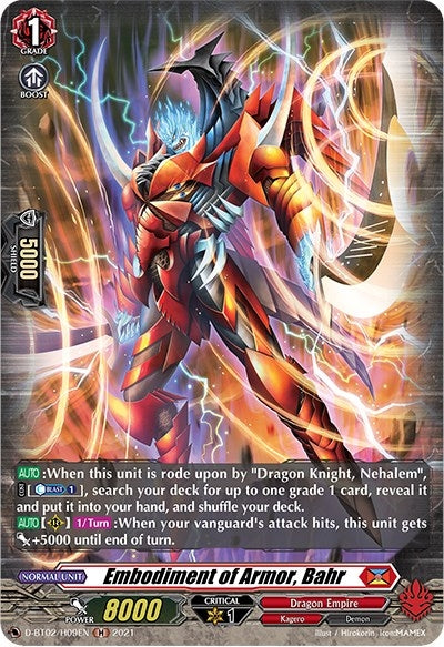 Description: [AUTO]:When this unit is rode upon by "Dragon Knight, Nehalem", [COST][Counter-Blast 1], search your deck for up to one grade 1 card, reveal it and put it into your hand, and shuffle your deck.