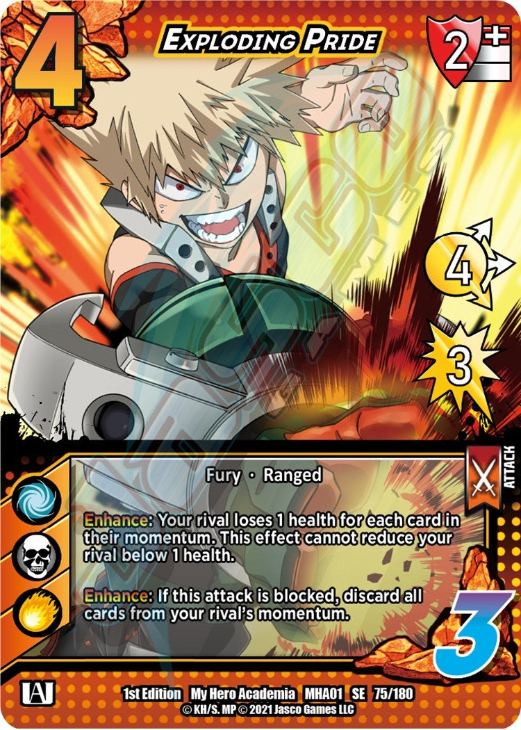 Enhance: Your rival loses 1 health for each card in their momentum. This effect cannot reduce your rival below 1 health. Enhance: If this attack is blocked, discard all cards from your rival’s momentum. |