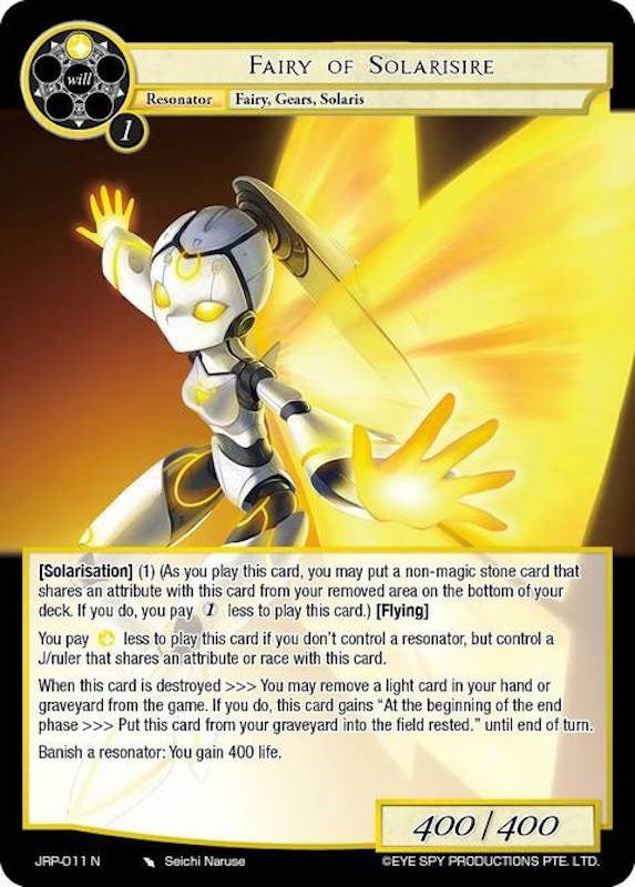 [Solarisation] (1) (As you play this card, you may put a non-magic stone card that shares an attribute with this card from your removed area on the bottom of your deck. If you do, you pay 1 less to play this card.)[Flying]