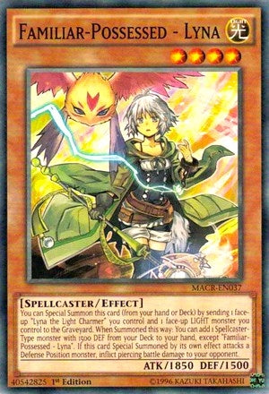 You can Special Summon this card (from your hand or Deck) by sending 1 face-up "Lyna the Light Charmer" you control and 1 face-up LIGHT monster you control to the Graveyard. When Summoned this way: You can add 1 Spellcaster-Type monster with 1500 DEF from your Deck to your hand, except "Familiar-Possessed - Lyna". If this card Special Summoned by its own effect attacks a Defense Position monster, inflict piercing battle damage to your opponent.