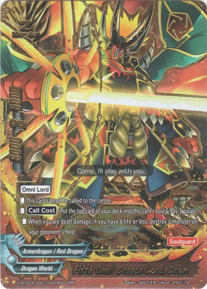 This card cannot be called to the center. [Call Cost] [Put the top card of your deck into this card's soul & Pay 1 gauge] When you are dealt damage, if you have 6 life or less, destroy a monster on your opponent's field. [Soulguard] |
