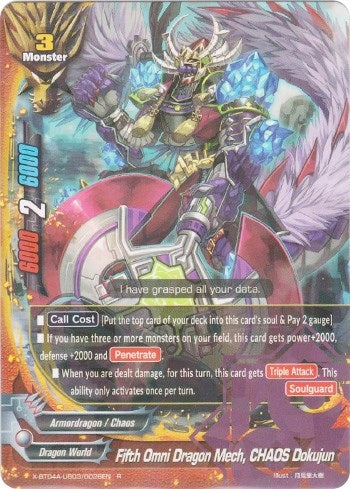 If you have three or more monsters on your field, this card gets power+2000, defense+2000, and [Penetrate]. When you are dealt damage, for this turn, this card gets [Triple Attack]. This ability only activates once per turn. [Soulguard] |
