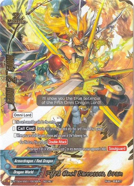 This card cannot be called to the center. [Call Cost] [Put thet op card of your deck into this card's soul & Pay 1 gauge] When you're dealt damage, choose and use one of the following two: • For this turn, this card gets [Double Attack]. • If you have 6 life or less, destroy a size 2 or less monster on your opponent's field. [Soulguard] |