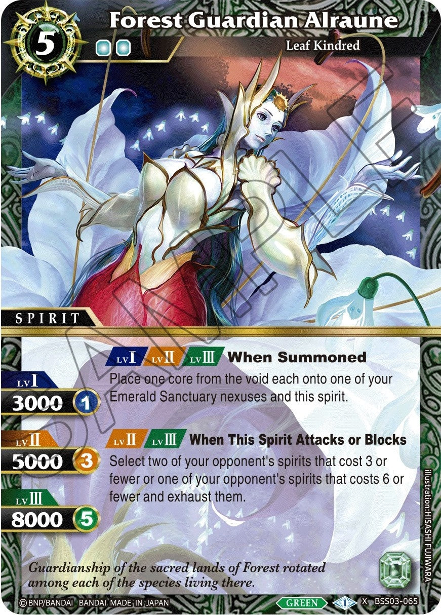 Place one core from the void each onto one of your Emerald Sanctuary nexuses and this spirit. [LV II] [LV III] When This Spirit Attacks or Blocks Select two of your opponent's spirits that cost 3 or fewer or one of your opponent's spirits that costs 6 or fewer and exhaust them. |