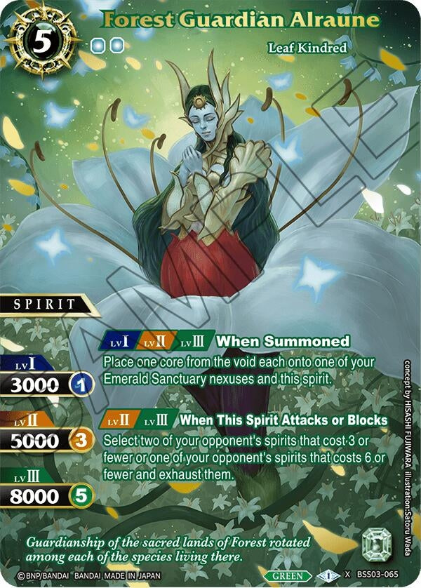 Place one core from the void each onto one of your Emerald Sanctuary nexuses and this spirit. [LV II][LV III]When This Spirit Attacks or Blocks Select two of your opponent's spirits that cost 3 or fewer or one of your opponent's spirits that costs 6 or fewer and exhaust them. |