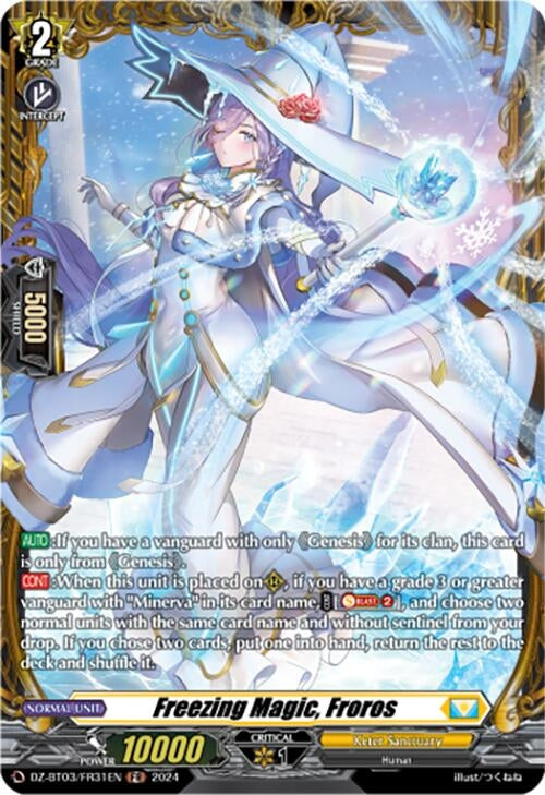 | Description: | [CONT]:If you have a vanguard with only "Genesis" for its clan, this card is only from "Genesis". [AUTO]:When this unit is placed on (RC), if you have a grade 3 or greater vanguard with "Minerva" in its card name, [COST][Soul-Blast 2], and choose two normal units with the same card name and without sentinel from your drop. If you chose two cards, put one into hand, return the rest to the deck and shuffle it. |
