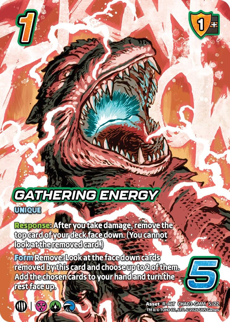 Response: After you take damage, remove the top card of your deck face down. (You cannot look at the removed card.) Form Remove: Look at the face down cards removed by this card and choose up to 2 of them. Add the chosen cards to your hand and turn the rest face up. |
