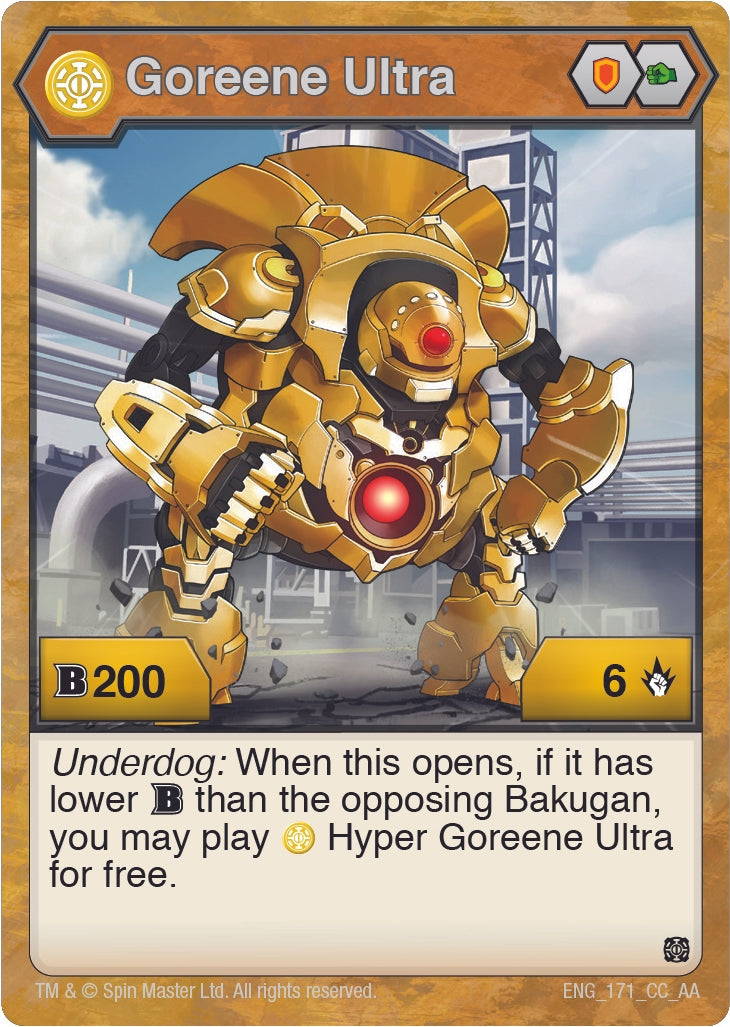 Underdog: When this opens, if it has lower [B-Power] than the opposing Bakugan, you may play [Aurelus] Hyper Goreene Ultra for free.