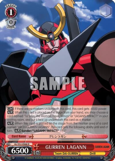 [AUTO] When this card is placed on the stage from your hand, you may choose a card named "To Save The Woman I Love, Simon" or "LAGANN IMPACT!" in your waiting room, and put it face up underneath this card as a marker. [AUTO] When this card is placed on the stage from the marker area of a card named "ARCH-GURREN LAGANN", this card gets the following ability until end of turn. "[AUTO] Sunder/"LAGANN IMPACT!" [(1)]" |