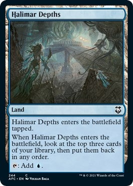 When Halimar Depths enters the battlefield, look at the top three cards of your library, then put them back in any order. T: Add U. |
