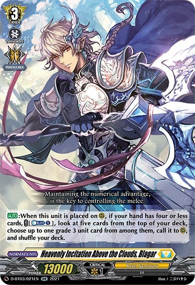 - Description: [AUTO]:When this unit is placed on (RC), if your hand has four or less cards, [COST][Counter-Blast 1]], look at five cards from the top of your deck, choose up to one grade 3 unit card from among them, call it to (RC), and shuffle your deck.