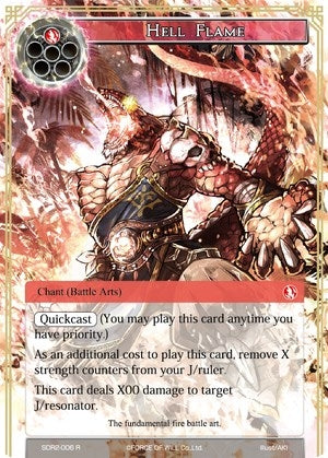 As an additional cost to play this card, remove X strength counters from your J/ruler. This card deals X00 damage to target J/resonator. |