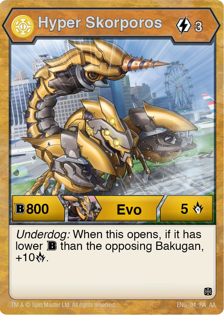 Underdog: When this opens, if it has lower [B-Power] than the opposing Bakugan, +10[Damage Rating].