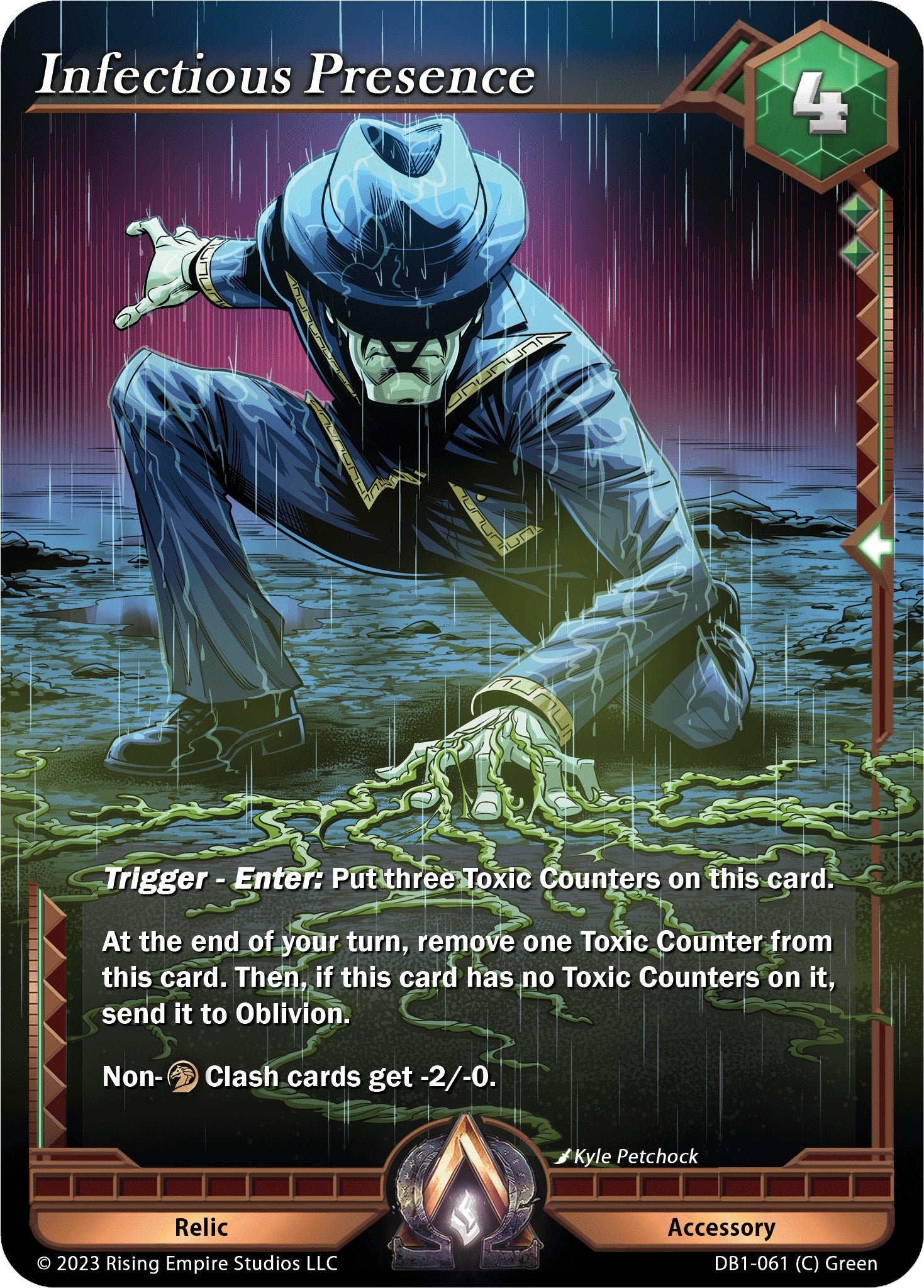 Trigger - Enter: Put three Toxic Counters on this card. At the end of your turn, remove one Toxic Counter from this card. Then, if this card has no Toxic Counters on it, send it to Oblivion. Non-(Harbinger symbol) Clash cards get -2/-0.