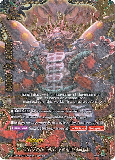 "Thunder Mine" When a monster enters your opponent's field, deal 1 damage to your opponent! [Act] Choose a monster on your opponent's field, and you may discard a "Hundred Demons" monster or a card with [Omni Lord] from your hand. If you do, destroy the chosen card. [Double Attack] [Soulguard] |