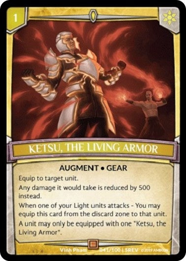 Any damage it would take is reduced by 500 instead. When one of your Light units attacks - You may equip this card from the discard zone to that unit. A unit may only be equipped with one "Ketsu, the Living Armor". |