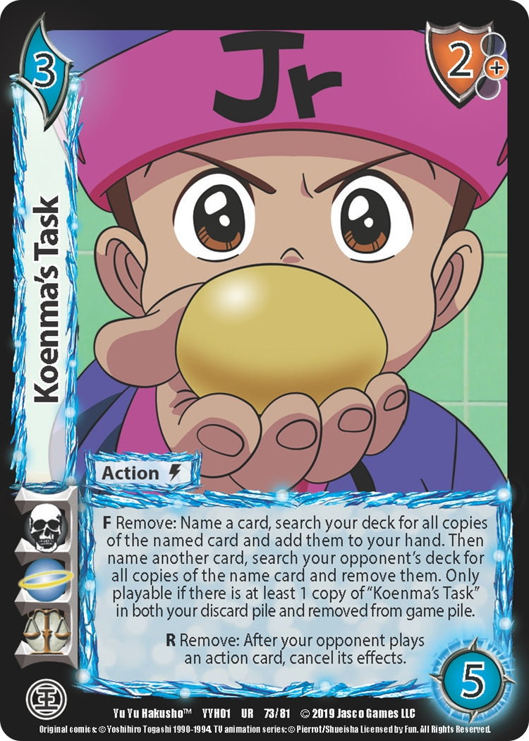 F Remove: Name a card, search your deck for all copies of the named card and add them to your hand. Then name another card, search your opponent's deck for all copies of the named card and remove them. Only playable if there is at least 1 copy of "Koenma's Task" in both your discard pile and removed from game pile. R Remove: After your opponent plays an action card, cancel its effects. |