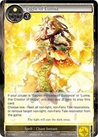 Rules Text Contains: | If your J/ruler is "Sacred Princess of Guidance" or "Lumia, the Creator of Hope", you may pay 2 less to play this card. Choose one - Rest all non-light, non-Fairy Tale resonators; or remove target non-light, non-Fairy Tale resonator from the game. |