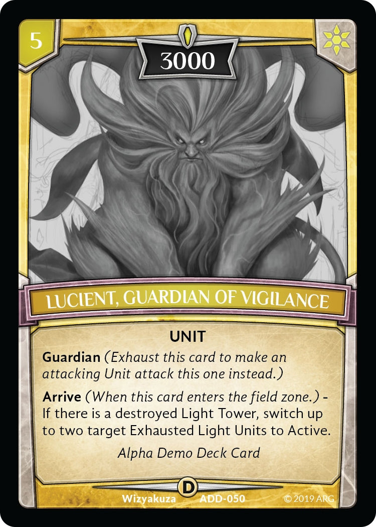 Guardian (Exhaust this card to make an attacking Unit attack this one instead.) Arrive (When this card enters the field zone.) - If there is a destroyed Light Tower, switch up to two target Exhausted Light Units to Active. |
