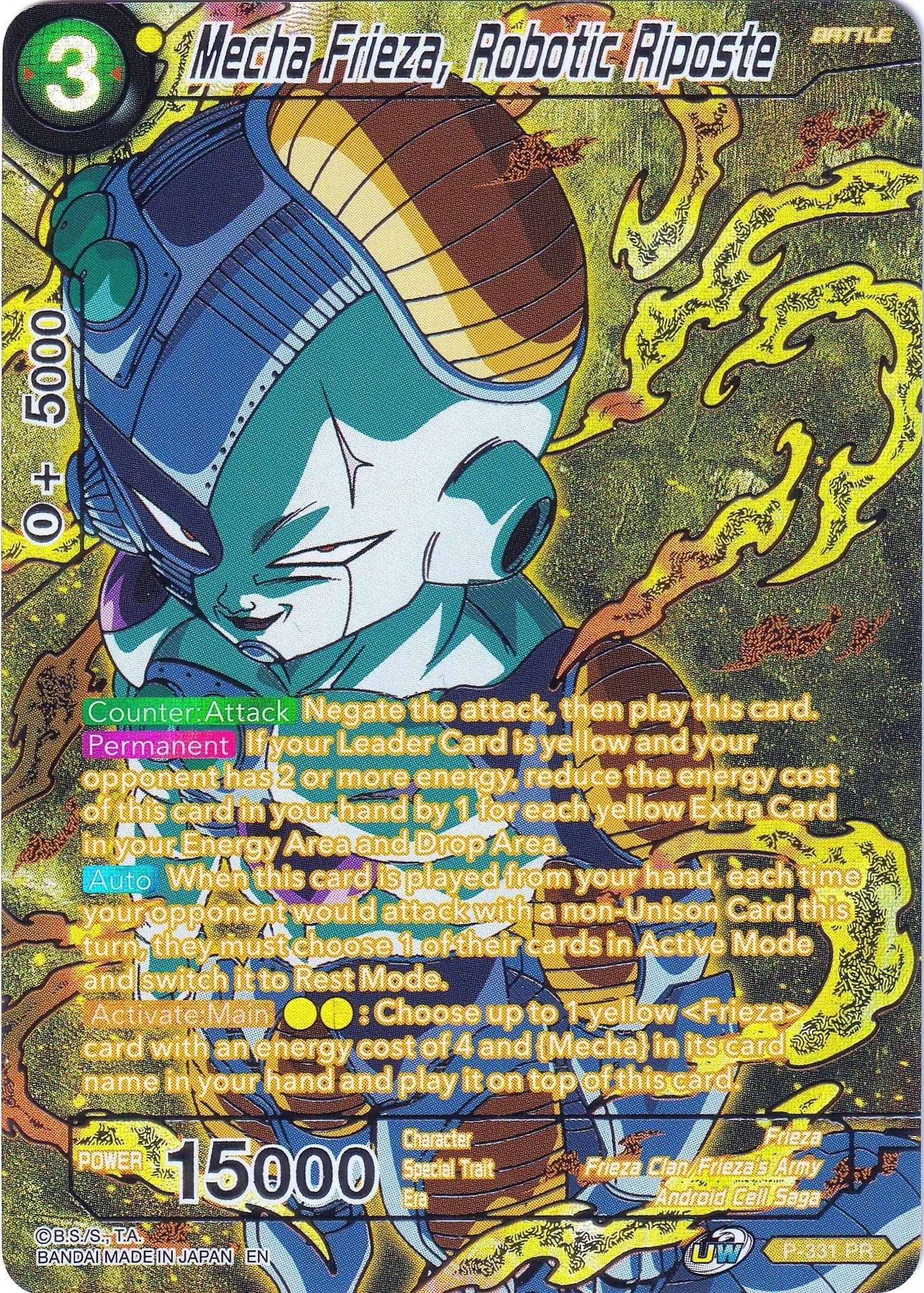 [Auto] When this card is played from your hand, each time your opponent would attack with a non-Unison Card this turn, they must choose 1 of their cards in Active Mode and switch it to Rest Mode. [Activate:Main] : Choose up to 1 yellow "Frieza" card with an energy cost of 4 and {Mecha} in its card name in your hand and play it on top of this card.